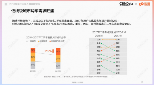 從消費區(qū)域來看,在整體消費升級大趨勢下,低線級城市購車需求旺盛。2017年三線以下城市的二手車用戶占比提升超過12%,其中西安、重慶、鄭州、沈陽等典型區(qū)域節(jié)點型城市交易愈發(fā)活躍。