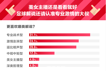 看世界杯不能少了球賽解說,當(dāng)前專業(yè)戰(zhàn)術(shù)型、激情澎湃型、逗逼相聲型等解說風(fēng)格各具特色。報(bào)告顯示,鐘愛專業(yè)戰(zhàn)術(shù)型解說的球迷最多,占比三成,美女主播的解說受歡迎程度欠佳,僅占4.6%。