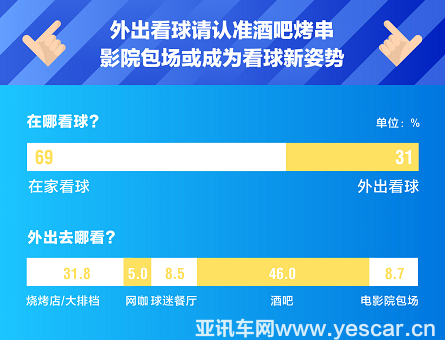 《優(yōu)信數(shù)說世界杯之球迷眾生相》報(bào)告就球迷觀賽姿勢(shì)進(jìn)行了大數(shù)據(jù)分析,數(shù)顯顯示,在調(diào)研球迷中,有三成選擇了外出看球,酒吧、燒烤店、電影院、球迷餐廳等成為“觀球圣地”。