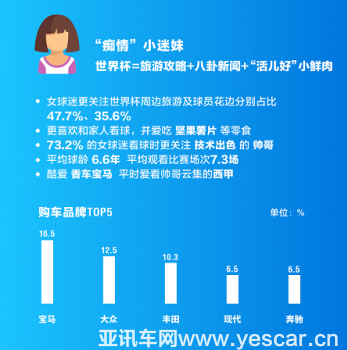 和“骨灰級(jí)”球迷不同,在很多“癡情”小迷妹看來,世界杯就是旅游攻略、八卦新聞和“活兒好”小鮮肉的代名詞。她們平均球齡6.6年,半數(shù)居住在一線城市,73.2%的女球迷看球時(shí)癡迷技術(shù)出色的帥哥。寶馬、大眾、豐田、現(xiàn)代、奔馳是這類女球迷的最愛購車品牌。