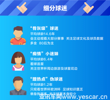 《優(yōu)信數(shù)說世界杯之球迷眾生相》報(bào)告將球迷細(xì)分為“骨灰級(jí)”球迷、“癡情”小迷妹、“蹭熱點(diǎn)”偽球迷三大類,其購車偏好有所差異。