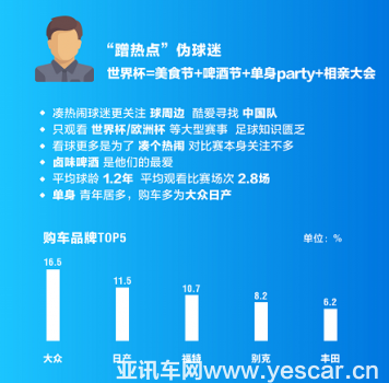“蹭熱點(diǎn)”偽球迷在世界杯期間更關(guān)注美食、單身party和相親大會(huì)等周邊娛樂活動(dòng),足球知識(shí)匱乏,看球多是為了湊熱鬧。他們?cè)谫徿嚻放七x擇上,更多人偏愛大眾、日產(chǎn)、福特、別克和豐田。