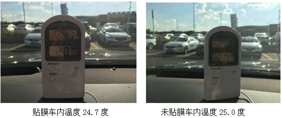車貼好膜后把兩輛車開到停車場(chǎng),我們把兩輛車的空調(diào)都打開,讓它們的原始溫度降得更低一點(diǎn),調(diào)到人體感覺比較舒適的25攝氏度左右后再進(jìn)行暴曬,記錄溫度隨時(shí)間變化的情況。