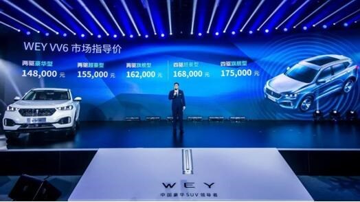 8月27日,在北京競園WEY品牌旗下的第四款量產車型VV6正式上市,共推出五款車型,兩驅豪華型售價14.80萬元、兩驅超豪型售價15.50萬元、兩驅旗艦型售價16.2萬元、四驅豪華型售價16.80萬元、四驅旗艦型售價17.5萬元。