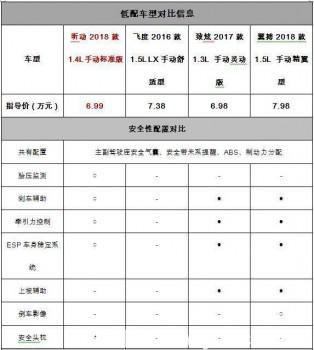 最后我們來看一下2018款昕動的配置,昕動共有七款車型,三個配置等級。我們分別從高中低配車型與競品車型的對比,來分析一下2018款昕動在安全性配置、舒適性配置方面的競爭力。