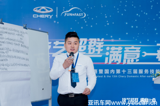 8強(qiáng)競賽重點(diǎn)考評奇瑞服務(wù)體系中標(biāo)準(zhǔn)服務(wù)流程從“建立關(guān)系、預(yù)約、接待、制單、維修、質(zhì)檢、校驗(yàn)、結(jié)算”等環(huán)節(jié),以實(shí)操的方式考核顧問們的接待專業(yè)性,服務(wù)周到性,選手們紛紛拿出自己最強(qiáng)的實(shí)力,絲毫不怯場,以最佳的姿態(tài)展示日常接待風(fēng)采。