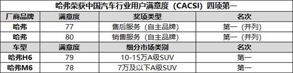 其中,哈弗品牌獲售后服務(wù)滿意度、銷售服務(wù)滿意度兩項(xiàng)第一;哈弗H6獲10-15萬A級(jí)SUV用戶滿意度第一,累計(jì)4年獲此殊榮;哈弗M6獲7萬級(jí)以下A級(jí)SUV用戶滿意度第一名。