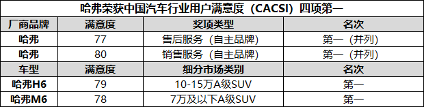 不少企業(yè)能造出不錯(cuò)的產(chǎn)品,但只有極少數(shù)企業(yè),能做到讓用戶在消費(fèi)過程中總是給出“滿意”的評(píng)價(jià)。近日,中國汽車質(zhì)量協(xié)會(huì)公布2018年中國汽車行業(yè)用戶滿意度(CACSI)測(cè)評(píng)結(jié)果,哈弗獲得行業(yè)4項(xiàng)第一。其中,哈弗品牌獲自主品牌售后服務(wù)滿意度、銷售服務(wù)滿意度兩項(xiàng)第一;哈弗H6獲10-15萬A級(jí)SUV用戶滿意度第一,累計(jì)4年獲此殊榮;哈弗M6獲7萬級(jí)以下A級(jí)SUV用戶滿意度第一名。