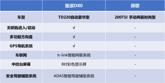 駿派D80售價(jià)為7.99-12.59萬(wàn)元,探歌售價(jià)13.98-20.98萬(wàn)元,可以說(shuō)駿派D80售價(jià)更為親民,稍占優(yōu)勢(shì)。雖然售價(jià)是探歌的六折,但產(chǎn)品實(shí)力是否過(guò)硬,我們還是要看更加詳細(xì)的對(duì)比結(jié)果。