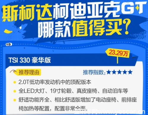 對于KODIAQ GT來說,這個豪華版可以說是最值得推薦的版本,電動座椅、自動泊車、更大的19英寸輪轂、全LED大燈前排座椅加熱等等的功能都齊全,1.3萬也是很劃算,畢竟買車買高配,值得推薦。