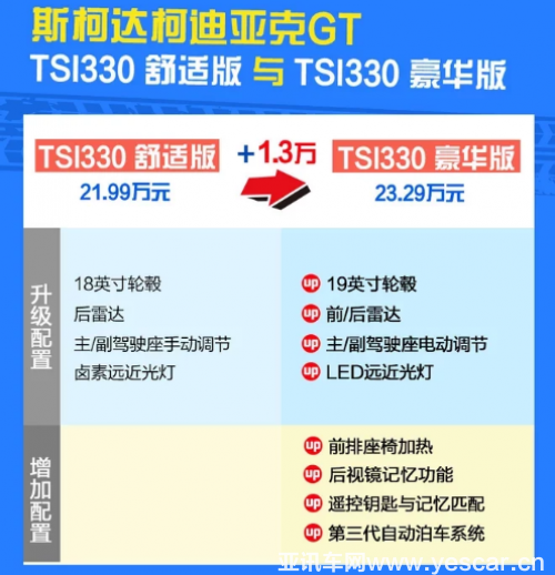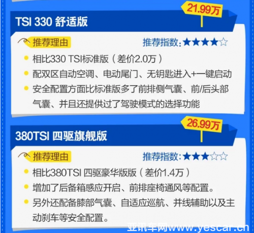 點評:TSI330舒適版比TSI330標準版高出2萬元,主要是升級了自動空調(diào)、織物/皮質(zhì)混搭座椅。增加了無鑰匙啟動/進入、電動后備箱、后視鏡電動折疊以及3個氣囊。這些確實提供了不少舒適便利性,所以還是很值得推薦的。