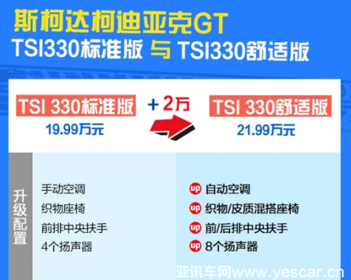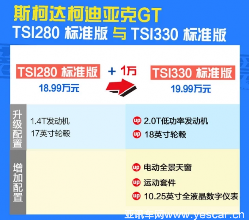 點評:KODIAQ GT TSI330標準版相比TSI標準版售價多了1萬元,從1.4T發(fā)動機升級到了2.0T的低功率發(fā)動機,配置方面還增加了電動全景天窗、運動套件以及彰顯科技氣息的10.25英寸的全液晶數(shù)字儀表盤,動力和科技面子配置方面都得到了很好的提升,1萬元的升級非常劃算。