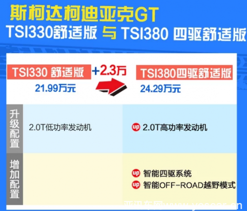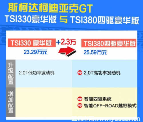 同樣是基于TSI 330豪華版升級的四驅(qū)豪華版,2.3萬的差價依然是四驅(qū)系統(tǒng)與高功率的2.0T發(fā)動機。