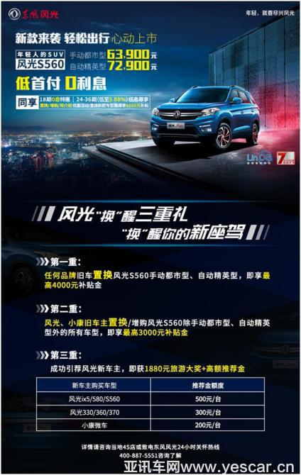 看著小編的介紹,相信大家一定感受到了風(fēng)光S560的驚人魅力,亮眼的設(shè)計(jì)、全面的配置、超大的空間還有澎湃的動(dòng)力,如果還不足以讓你不假思索把風(fēng)光S560開回家,那么這里還有一個(gè)好消息。年底風(fēng)光S560推出了各種優(yōu)惠購(gòu)車政策,可以說(shuō)對(duì)于手握6萬(wàn)元的消費(fèi)者,購(gòu)買風(fēng)光S560 1.8L手動(dòng)都市型完全沒(méi)有壓力。