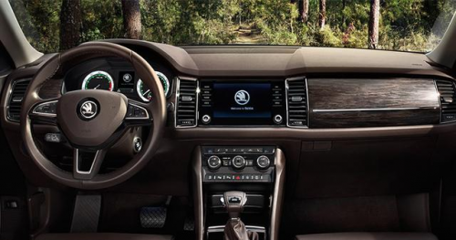坐進車里看設(shè)計,柯迪亞克流線式的操作臺一氣呵成,中控臺上部使用軟性材料覆蓋彰顯體貼感,副駕駛前方的木紋裝飾面板商務(wù)氣息十足。中間的6.5寸多媒體交互系統(tǒng)采用彩色多點觸控式電容屏,能聽音樂放松,也能智能導(dǎo)航,強光下也能清晰顯示。