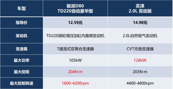 兩臺(tái)車(chē)在動(dòng)力系統(tǒng)的選擇上出現(xiàn)了明顯的“分歧”,“奕澤2.0L 奕動(dòng)版”使用2.0L自然吸氣發(fā)動(dòng)機(jī),而“駿派D80 TD220自動(dòng)豪華型”則采取了TD220渦輪增壓加缸內(nèi)直噴的方案。