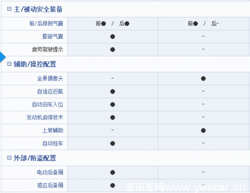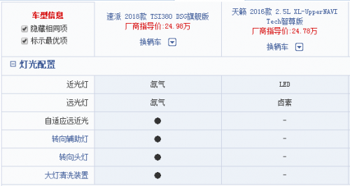 配置方面,兩款車自然都有不俗的配置,天籟近光燈為L(zhǎng)ED大燈, 速派為氙氣大燈,但比天籟和多了自適應(yīng)遠(yuǎn)近光、轉(zhuǎn)向輔助燈、轉(zhuǎn)向頭燈和大燈清洗裝置。實(shí)用性方面,速派比天籟多了感應(yīng)雨刷、后視鏡自動(dòng)防眩目、后風(fēng)擋遮陽簾、副駕后排可調(diào)節(jié)、后排座椅加熱、自適應(yīng)巡航、自動(dòng)泊車等等。安全性方面,速派雖較之天籟多了膝部氣囊、疲勞提醒等,優(yōu)勢(shì)明顯。