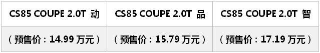 此前備受關注的長安CS85 COUPE于1月10日公布了動、品、智三款車型的預售價,價格區(qū)間從14.99萬元——17.19萬元。