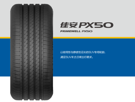 PX50是以耐用性與靜音性見長的SUV專用輪胎,高強度冠帶層,有效吸收輪胎行駛過程中的沖擊和振動能量,讓車輛吸振安穩(wěn)不顛簸;高強度雙層鋼絲帶束層則降低輪胎被刺穿的概率,延長輪胎壽命,提升了整個輪胎產(chǎn)品的耐久性能。
