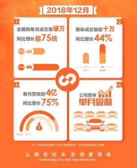 據(jù)媒體報(bào)道稱,優(yōu)信在2018年12月份實(shí)現(xiàn)了單月整體成交量超10萬(wàn)輛,同比增長(zhǎng)44%,其中,與淘寶合作的全國(guó)購(gòu)單月成交量破1萬(wàn)輛,同比增長(zhǎng)超75倍的成績(jī)。意味著,二手車(chē)也可與其他產(chǎn)品一樣,成為電商平臺(tái)的重要商品流通。