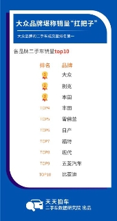 本月品牌銷量情況統(tǒng)計(jì)中,天天拍車3月大數(shù)據(jù)顯示,大眾、別克、本田品牌的車賣得最多,在銷量排行榜前十名中占據(jù)前三席,緊隨其后的品牌是豐田、雪佛蘭、日產(chǎn)、福特、現(xiàn)代、五菱汽車、比亞迪。