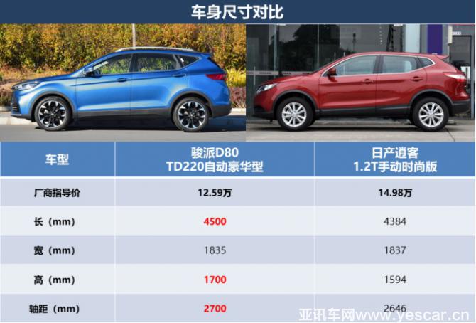 我們先來(lái)簡(jiǎn)單熟悉一下兩款車(chē)。本次,我們選擇了價(jià)格相近的兩款車(chē)型做對(duì)比:“駿派D80 TD220自動(dòng)豪華型”和“逍客1.2T手動(dòng)時(shí)尚版”,兩者售價(jià)分別為12.59萬(wàn)元和13.98萬(wàn)元。