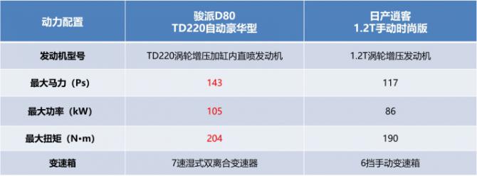 駿派D80全系搭載TD220渦輪增壓加缸內(nèi)直噴發(fā)動(dòng)機(jī),而“逍客1.2T手動(dòng)時(shí)尚版”則是一臺(tái)1.2T渦輪增壓發(fā)動(dòng)機(jī):前者擁有105kW的最大功率,以及204N·m的峰值扭矩;后者的最大馬力僅為117kW,峰值扭矩190N?m。再加上駿派D80的最大扭矩轉(zhuǎn)速在1600-4200rpm之間,相比“逍客1.2T手動(dòng)時(shí)尚版”2000-4000rpm的最大扭矩轉(zhuǎn)速,能讓用戶(hù)享受更強(qiáng)勁的加速推背感。