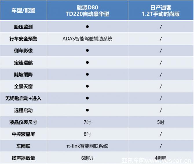 如果說(shuō)動(dòng)力方面的對(duì)比已經(jīng)讓“逍客1.2T手動(dòng)時(shí)尚版”有點(diǎn)“吃不消”的話(huà),那在其他方面的對(duì)比,“駿派D80 TD220自動(dòng)豪華型”也是有著極強(qiáng)的產(chǎn)品力。