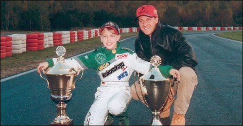 圖為維特爾8歲時贏得卡丁車比賽,舒馬赫為他頒發(fā)獎杯