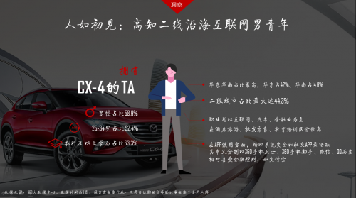 營銷之初,一汽馬自達(dá)借助360大數(shù)據(jù),分析了前代車型的已購車人群,對比360汽車用戶發(fā)現(xiàn),匹配率超過63%。因此,透過這些精準(zhǔn)的用戶樣本,繪制了CX-4這款車型的人群畫像,他們男性占比高,25-34歲占52.4%,喜歡自駕出游,依賴搜索和導(dǎo)航,喜歡系統(tǒng)安全及社交類APP...。