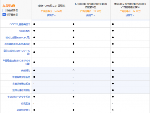 自駕出游,安全第一。在安全配置方面,三款SUV均配置了ABS防抱死、EBD制動力分配、EBA剎車輔助、TCS牽引力控制、ESP車身穩(wěn)定等安全系統(tǒng)。哈弗F7、CR-V還集成了ACC自適應(yīng)巡航、LCA并線輔助、LDW車道偏離預(yù)警、TSR交通限速標(biāo)志智能識別、360度全景影像等黑科技配置,主動安全配置明顯比探歌更豐富。三款SUV中,哈弗F7還獨(dú)有CTA倒車側(cè)向警告、DOW開門預(yù)警系統(tǒng),相比之下,20.38萬元的探歌,就顯得很小氣了。