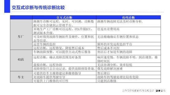 隨著汽車智能化的發(fā)展和通信技術(shù)的提高,汽車診斷技術(shù)向著智能化,無人化發(fā)展。智能化診斷技術(shù)使OBD設(shè)備淡化,診斷儀云服務(wù)化,真正實(shí)現(xiàn)隨時(shí)進(jìn)行檢測(cè)故障,排除故障。遠(yuǎn)程診斷技術(shù)與傳統(tǒng)診斷技術(shù)主要區(qū)別在于使車輛制造商由被動(dòng)診斷變?yōu)橹鲃?dòng)診斷,能夠隨時(shí)或者定期對(duì)車輛進(jìn)行遠(yuǎn)程診斷,并遠(yuǎn)程修復(fù)故障(借助OTA技術(shù))的能力。