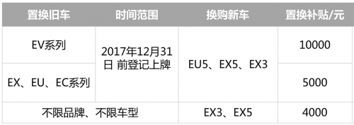 同時(shí),2017年12月31日前登記上牌的EX、EU、EC系列的私人用戶,換購(gòu)EU5、EX5、EX3等三款車(chē)型,同樣可獲得5000元的現(xiàn)金置換補(bǔ)貼。