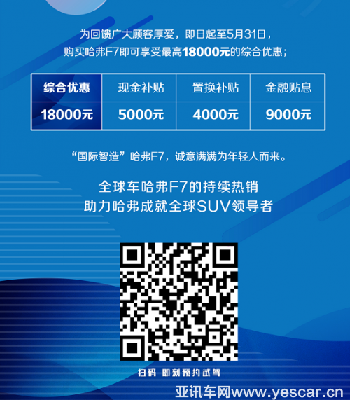 即日起至5月31日,只要你到全國(guó)任何一家哈弗4S店,現(xiàn)場(chǎng)訂購(gòu)“AI智能網(wǎng)聯(lián)SUV”哈弗F7,即可獲得“三重大禮”,享受最高18000元的綜合優(yōu)惠!其中包括現(xiàn)金禮(現(xiàn)金補(bǔ)貼5000元),置換禮(置換補(bǔ)貼4000元),金融禮(金融貼息9000元)。對(duì)于有心入手哈弗F7的朋友們來(lái)說(shuō),這是一次絕佳的購(gòu)買(mǎi)時(shí)機(jī)。如果能果斷入手,收獲的不僅僅是免受夏日酷暑和風(fēng)雨之苦,還相當(dāng)于提前得到了三次自駕游的費(fèi)用!