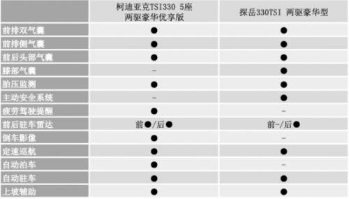 小結(jié):安全配置方面,兩車都配備前排雙氣囊、前排側(cè)氣囊、胎壓監(jiān)測(cè)、后倒車?yán)走_(dá)、定速巡航、自動(dòng)駐車和上坡輔助。其中,柯迪亞克獨(dú)享疲勞駕駛提醒、前倒車?yán)走_(dá)、倒車影像和自動(dòng)泊車四項(xiàng)配置,探岳獨(dú)享膝部氣囊和主動(dòng)安全系統(tǒng)兩項(xiàng)配置。