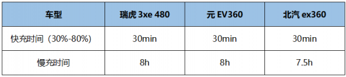 在充電時(shí)長(zhǎng)方面,三款車型在數(shù)據(jù)上的表現(xiàn)較為接近,都宣稱快充可以做到30分鐘將電量從30%充至80%,而慢充狀態(tài)下,瑞虎3xe 480與元EV360都需要8個(gè)小時(shí),北汽ex360則需7.5個(gè)小時(shí)。不過考慮到瑞虎3xe 480電池容量更大,其實(shí)在充電速度方面更加強(qiáng)悍,并且還有長(zhǎng)續(xù)航加持,實(shí)際體驗(yàn)下瑞虎3xe 480會(huì)更勝一籌。