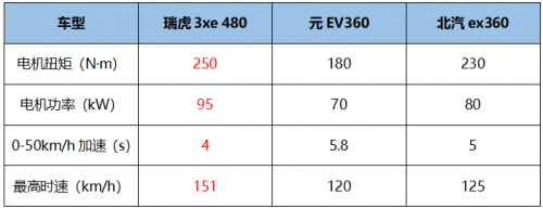 三款車型作為電動(dòng)車,具有扭矩輸出迅速的特性,動(dòng)力表現(xiàn)都不錯(cuò),但電機(jī)功率最大的車型是瑞虎3xe 480,同時(shí)扭矩最大的也是它,最大功率達(dá)到了95kW,扭矩高達(dá)250N·m。并且瑞虎3xe 480 0-50km/h加速僅需4s,而元EV360為5.8s,北汽ex360為5s,實(shí)際感受的話,這一秒多的差距是挺大的。此外,瑞虎3xe 480最高車速為151km/h,相比于其他兩款車有不小的優(yōu)勢(shì),足以應(yīng)付高速工況,不會(huì)出現(xiàn)油門踩不動(dòng)的情況。