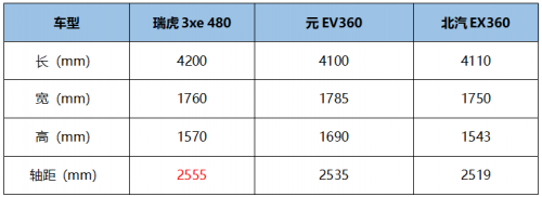 空間大小決定了車輛的載人、儲(chǔ)物能力,在同類型產(chǎn)品中可能是不少消費(fèi)者下定決心購(gòu)買的關(guān)鍵。三款車型在尺寸上的對(duì)比如下,瑞虎3xe 480:4200mm/1760mm/1570mm,軸距2555mm;比亞迪元ev360:4100mm/1785mm/1690mm,軸距2535mm;北汽ex360:4110mm/1750mm/1543mm,軸距2519mm。瑞虎3xe在車長(zhǎng)及車軸距方面均有明顯優(yōu)勢(shì)。真實(shí)的空間上和實(shí)際體驗(yàn)上來說,瑞虎3xe 480與比亞迪元ev360差別不大,北汽ex360則較為不佳。