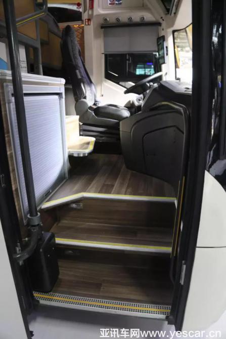 登車(chē)臺(tái)階左側(cè)是司機(jī)臨時(shí)休息倉(cāng),配有空調(diào)出風(fēng)口和照明燈。該倉(cāng)位的設(shè)計(jì)十分巧妙,不用占據(jù)行李艙的空間。