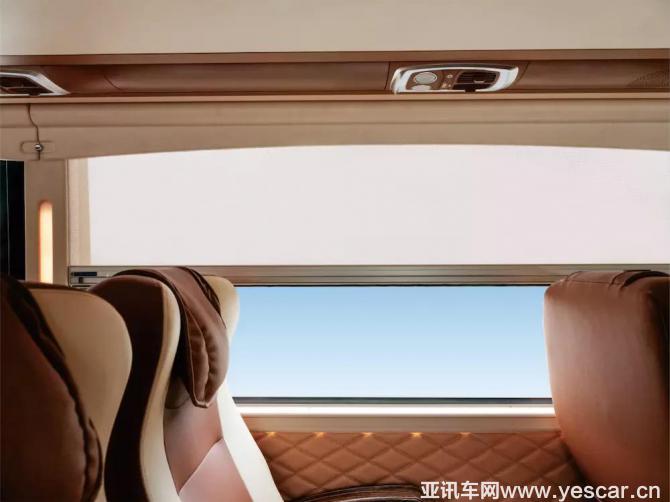 窗簾采用了與高鐵類(lèi)似的上下推拉設(shè)計(jì),安全門(mén)同樣設(shè)有窗簾。旁邊的柱子上安裝有照明燈,下方墻壁上還設(shè)有氛圍燈。
