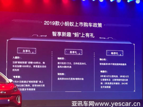 而本次2019款小螞蟻,除在產(chǎn)品端繼續(xù)為用戶帶來了巨大的升級驚喜之外,在購車政策上也體現(xiàn)了其作為行業(yè)領(lǐng)軍品牌滿滿的誠意,尤其是其配合“螞蟻聯(lián)盟”的多項專屬會員福利,更顯示出其對升級用戶服務(wù),以及更懂用戶、反饋用戶上的用心。而隨著新車銷售政策的出臺,未來這款“更懂你的智趣純電小車”又將為我們交上一份怎樣的答卷,一同拭目以待。
