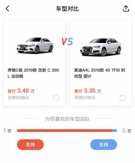 筆者也在第一時間嘗了鮮,就拿筆者選擇的奔馳C級2019款C260L以及奧迪A4L 2019款 40TFSI來說,兩輛車的照片各占頂部兩側(cè),看起來非常清爽,你還可以給這兩輛車投票,看看誰的人氣更高一些。