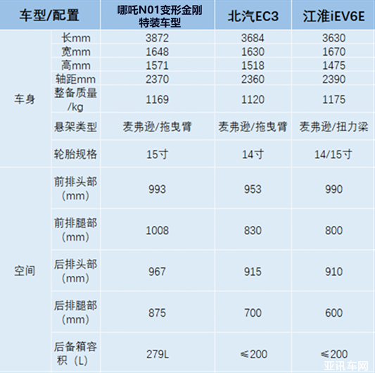 相比之下,北汽EC3和江淮iEV6E的整體造型就顯得中規(guī)中矩了。由于傳統(tǒng)車企設(shè)計(jì)風(fēng)格的轉(zhuǎn)變存在滯后性,北汽EC3和江淮iEV6E仍帶有較強(qiáng)的燃油車特質(zhì),過于突出的前臉搭配小巧的車身,給人一種虎頭蛇尾的違和感;而在這樣的結(jié)構(gòu)比例下,純電元素的點(diǎn)綴也就不能很好的營造出應(yīng)有的前衛(wèi)氣質(zhì)。與此同時(shí),在車身尺寸方面,北汽EC3的車身尺寸為3684*1630*1518mm,江淮iEV6E為3630*1670*1475mm,對比哪吒N01 變形金剛特裝車型的3872*1648*1571mm可以說是全面落后,駕乘體驗(yàn)孰優(yōu)孰劣不言而喻。