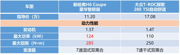 大眾探歌搭載的是1.4T發(fā)動(dòng)機(jī),最大功率110kW,最大扭矩250N?m,整體上動(dòng)力輸出效果不及新H6 Coupe。