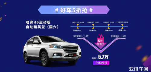 西方萬(wàn)圣節(jié)結(jié)束,即將開啟的便是源于神秘東方的購(gòu)物節(jié)日“雙11”,那么屆時(shí)購(gòu)買哈弗SUV是否有優(yōu)惠呢?答案是肯定的,而且哈弗SUV已經(jīng)搶跑今年“雙11”,推出 “好車5折搶”系列活動(dòng),參與者只需5.7萬(wàn)就能秒殺哈弗H6運(yùn)動(dòng)版!