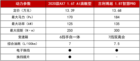 即使面對一大波煥新國六動力的同價位新車,2020款AX7的動力組合也毫不遜色。以博越智慧PRO為例,它搭載的國六版1.8T發(fā)動機基本保持了原有的動力水平,但相比之下,作為一款排量更大的發(fā)動機,它在動力系數(shù)上的優(yōu)勢卻并不明顯,而工況綜合油耗卻高達7.5L/100km;此外,在博越這款定價比2020款AX7頂配還高的車型上,不僅搭載的是7擋雙離合變速器,更缺失換擋撥片這一配置。在三大件方面的綜合實力孰優(yōu)孰劣,一看便知。