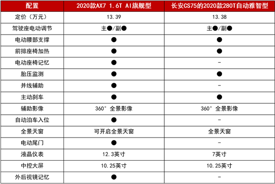 即使與同價位的長安CS75的2020款280T自動雅智型相比,2020款AX7旗艦型更在細節(jié)中體現(xiàn)出一種越級的尊貴感,不僅在整體配置水平上不輸長安CS75,更多出自動泊車入位、駕駛席座椅迎賓記憶功能、感應式電動尾門、外后視鏡倒車自動調節(jié)+記憶等越級功能,以超值的性價比更帶來舒心的駕乘享受。