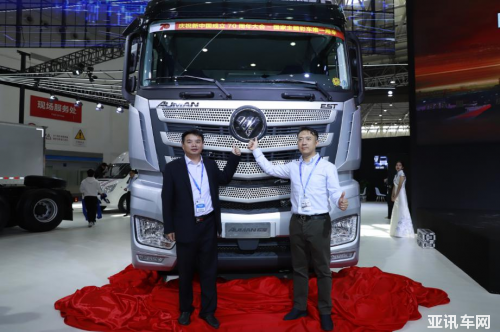 【福田汽車集團品牌副總裁、福田戴姆勒汽車品牌戰(zhàn)略總監(jiān)李健與福田戴姆勒汽車營銷公司鄂贛分公司總經理程志堅共同揭幕歐曼超級重卡國典版】