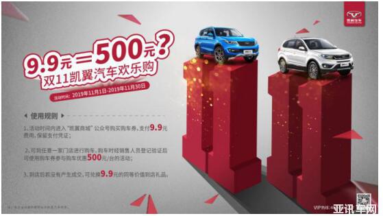 凱翼汽車震撼推出“雙11凱翼汽車歡樂購”活動(dòng),消費(fèi)者可通過關(guān)注官方公眾號(hào)或掃描二維碼等方式進(jìn)入凱翼商城,僅需支付9.9元,就可購得500元購車券,用于抵扣線下任意4S店的購車費(fèi)用。即使消費(fèi)者不購車,禮券也可以在4S店用于換取等值禮品。凱翼汽車雙11不搞噱頭不玩套路,讓消費(fèi)者真實(shí)體驗(yàn)凱翼汽車優(yōu)越品質(zhì)和貼心化的服務(wù)同時(shí),實(shí)實(shí)在在享受到價(jià)格上的福利。
