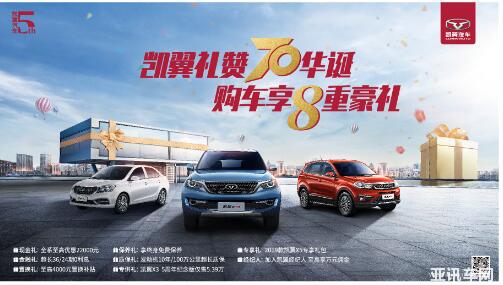 除9塊9抵500元購車券活動(dòng)及凱翼X3五周年版鉅惠10000元的購車福利外,凱翼汽車全系還推出了其他一系列豪禮活動(dòng),包括: